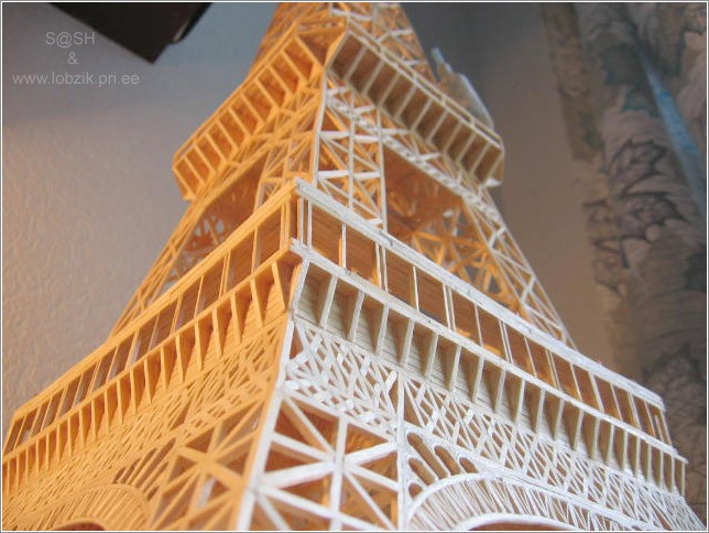 Лично мне не хватило бы терпения даже просто пересчитать 7464 спичек, а вот Александр Пашкевич из Украины не только пересчитал их, не только сделал из них 15 000 более мелких деталей, но и собрал из этих деталей макет Эйфелевой башни высотой в метр. Так мало того, Александр вмонтировал в модель систему подсветки светодиодами, спрятав проводку ... внутрь спичек! Не верите, что это возможно? Я бы тоже засомневался, если бы не подробные фотографии. Смотрим (кликаем по картинке) ...