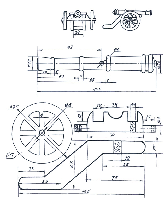 Материалы: фанера, брусок (ствол-то деревянный, хотя, как вариант - можно выточить и из металла), жесть (латунь, сталь, ...). Все элементы и тонкости сборки хорошо видны на фотографиях, а подробный чертеж всех деталей можно скачать, нажав на ссылку под статьей, выглядит он примерно так: