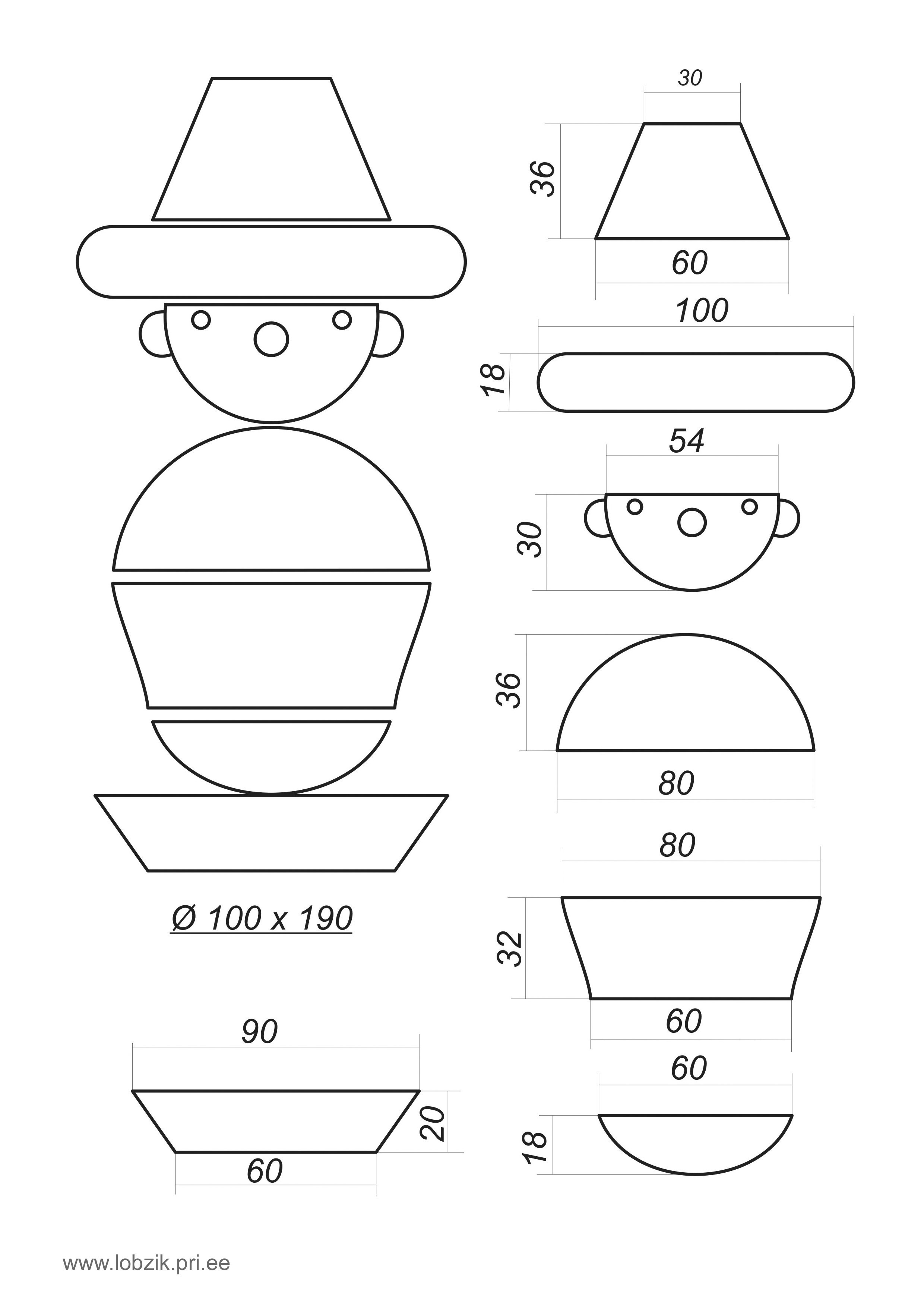 В оригинале, согласно предлагаемым размерам, высота пирамидки - 190мм, максимальный диаметр - 100мм. Но легко можно уменьшить размеры в необходимом масштабе. Можете скачать два чертежа - общий вид и особенности конструкции на первом чертеже