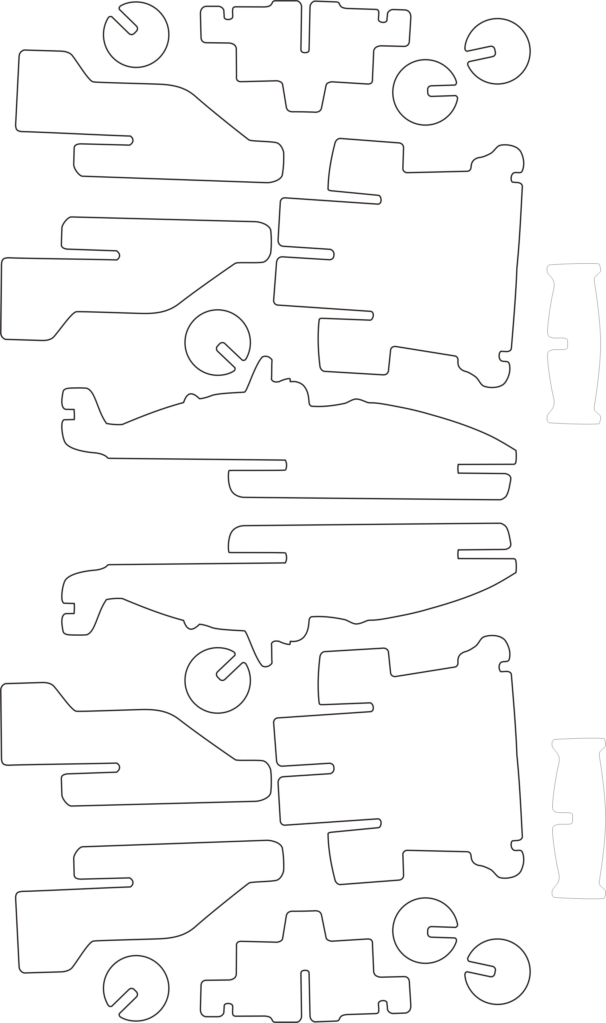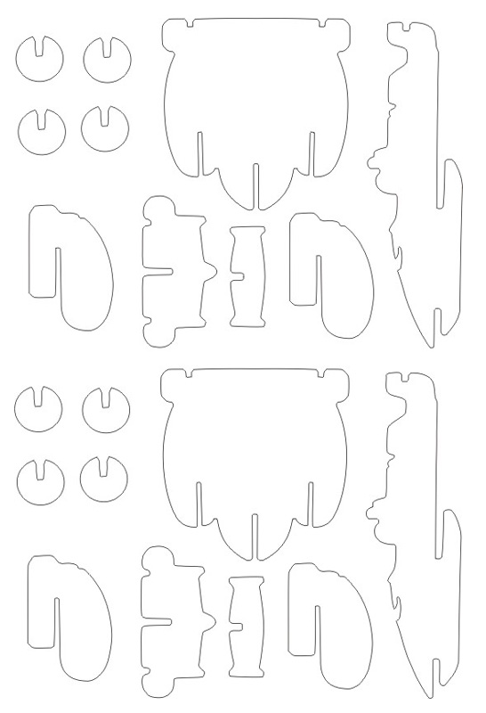 Сами игрушки нашли дети в яйцах Киндер-Сюрприз. Сделаны из пластмассы, длина - около 40 мм. Для нас вами, естественно, больше подходит в качестве материала фанера, следовательно, и габариты моделей увеличатся. По-моему, оптимальной будет длина 80-90мм. Для любителей поразукрашивать поделки - полнейший простор для фантазии. Оригинальная же раскраска хорошо видна на приложенных файлах - здесь и сканы деталек двумя комплектами вот такого плана, только в большем разрешении: